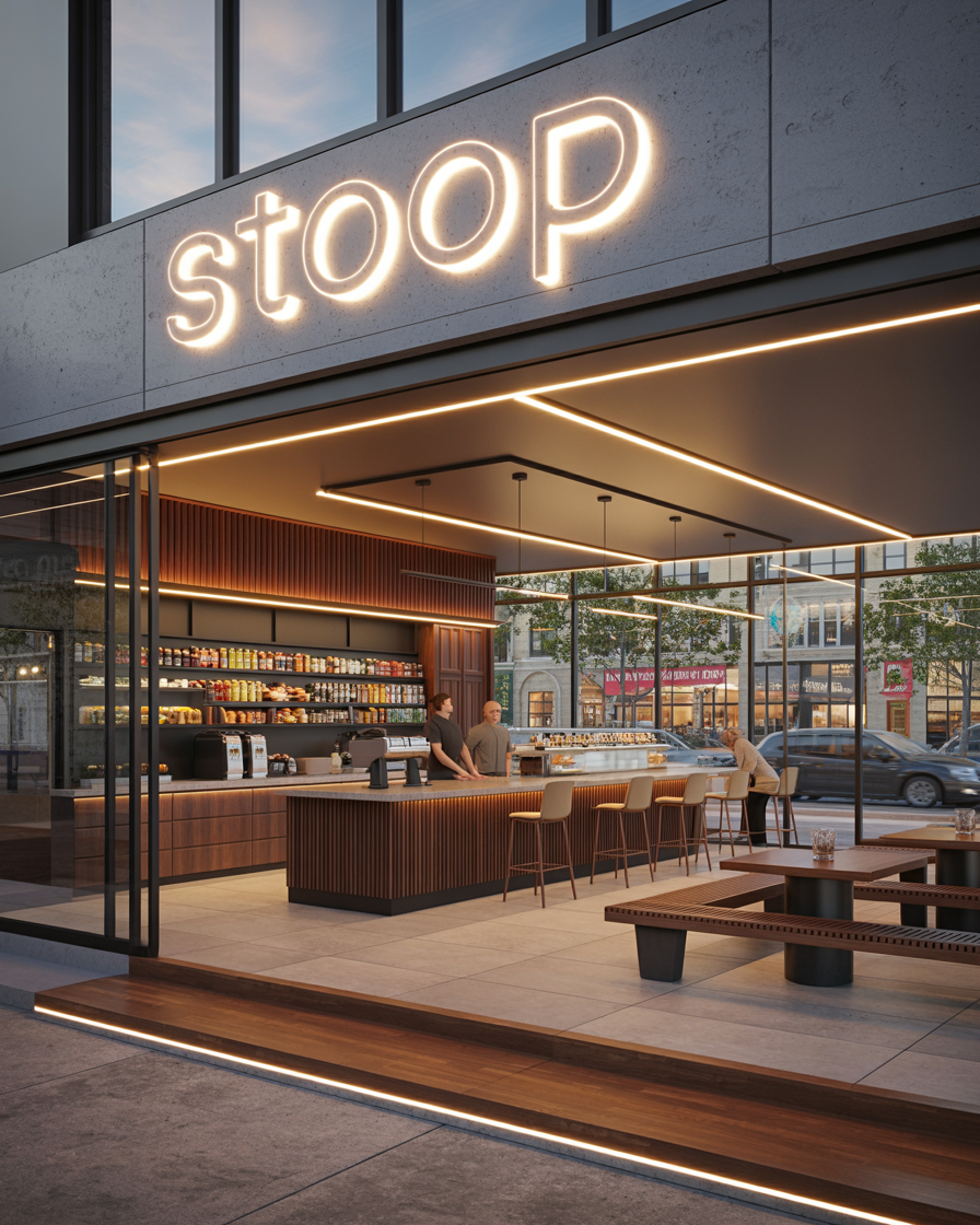 Stoop at Lift is Aurum’s modernized corner-store prototype designed for mixed-use communities and residential-dense environments. Located within the Lift building, Stoop brings curated convenience and neighborhood engagement to an activated street-level storefront.